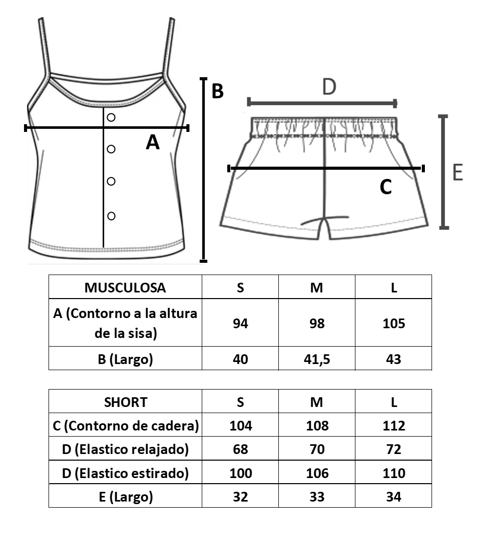 Nuestros talles son reales, asique te recomendamos elegir tu talle habitual. La musculosa es amplia, porque ante todo, comodidad para dormir 🙌. La modelo de las fotos está usando un talle S y sus medidas son 80-64-94.